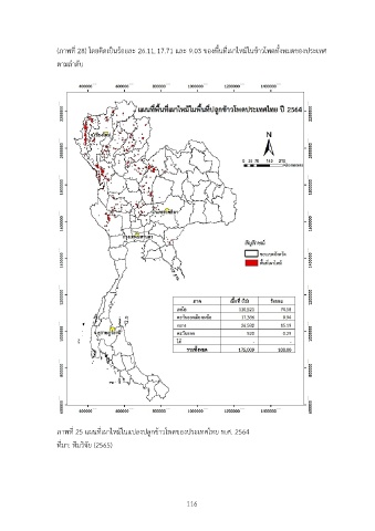 (ภาพที่ 28) โดยคิดเป\นรDอยละ 26.11, 17.71 และ 9.03 ของพื้นที่เผาไหมDในขDาวโพดทั้งหมดของประเทศ ตามลำดับ ภาพที่ 25 แผนที่เผาไหมDในแปลงปลูกขDาวโพดของประเทศไทย พ.ศ. 2564 ที่มา: ทีมวิจัย (2565) 116