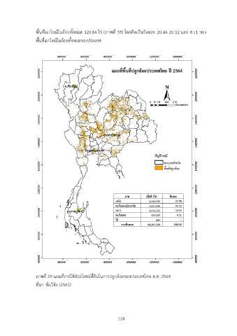 พื้นที่เผาไหมDในอDอยทั้งหมด 126,84 ไรI (ภาพที่ 33) โดยคิดเป\นรDอยละ 20.44 20.12 และ 8.11 ของ พื้นที่เผาไหมDในอDอยทั้งหมดของประเทศ ภาพที่ 29 แผนที่การใชDประโยชน1ที่ดินในการปลูกอDอยของประเทศไทย พ.ศ. 2564 ที่มา: ทีมวิจัย (2565) 124