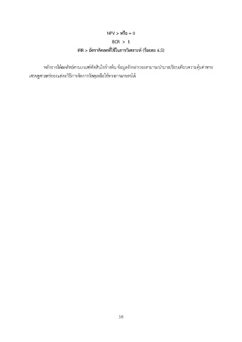 NPV > หรือ = 0 BCR > 1 IRR > อัตราคิดลดที่ใช4ในการวิเคราะหH (ร4อยละ 6.5) หลังจากไดDผลลัพธ1ตามเกณฑ1ตัดสินใจขDางตDน ขDอมูลดังกลIาวจะสามารถนำมาเปรียบเทียบความคุDมคIาทาง เศรษฐศาสตร1ของแตIละวิธีการจัดการวัสดุเหลือใชDทางการเกษตรไดD 58