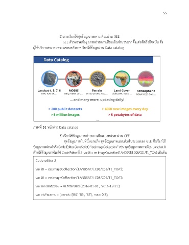 GEE ด้รวบรวมข้อมูลภาพถ่ายดาวเทียมเป็นจ านวนมากตั้งแต่อดีตถึงปัจจุบัน ซึ่ง