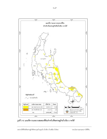 3-27 รูปที่ 3-6 แผนที่ความเหมาะสมของที่ดินส าหรับพืชเศรษฐกิจถั่วเขียว ภาคใต้ เขตการใช้ที่ดินพืชเศรษฐกิจพืชตระกูลถั่วฤดูแล้ง (ถั่วเขียว ถั่วเหลือง ถั่วลิสง) กองนโยบานและแผนการใช้ที่ดิน