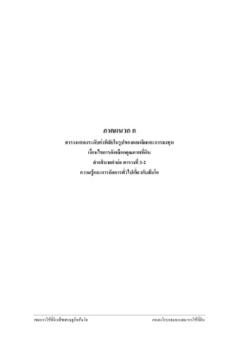 ผก-1 ภาคผนวก ก ตารางแสดงระดับคาพิสัยในรูปของผลผลิตและการลงทุน เงื่อนไขการคัดเลือกคุณภาพที่ดิน คําอธิบายคํายอ ตารางที่ 3-2 ความรูและการจัดการทั่วไปเกี่ยวกับสมโอ เขตการใช้ที่ดินพืชเศรษฐกิจส้มโอ กองนโยบายและแผนการใช้ที่ดิน
