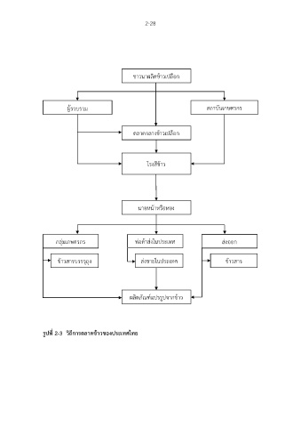 2-28 ชาวนาผลิตข้าวเปลือก ผู้รวบรวม สถาบันเกษตรกร ตลาดกลางข้าวเปลือก โรงสีข้าว นายหน้าหรือหยง กลุ่มเกษตรกร พ่อค้าส่งในประเทศ ส่งออก ข้าวสารบรรจุถุง ส่งขายในประเทศ ข้าวสาร ผลิตภัณฑ์แปรรูปจากข้าว รูปที่ 2-3 วิถีการตลาดข้าวของประเทศไทย