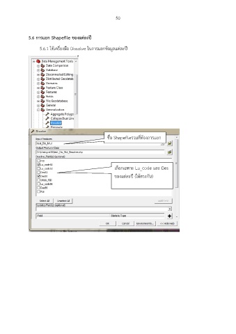 50 5.6 กำรแยก Shapefile ของแต่ละปี ้ 5.6.1 ใช้เครื่องมอ Dissolve ในการแยกขอมูลแต่ละปี ื ชื่อ Shapefileรวมที่ต้องการแยก เนื้อท ี่ เลือกเฉพาะ Lu_code และ Des ของแต่ละปี (ให้ตรงกัน)